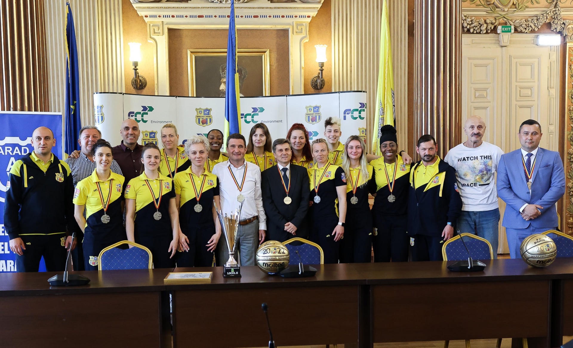 Vicecampioana României la baschet feminin, echipa FCC Baschet UAV Arad a revenit acasă. Performanța fetelor de argint a fost celebrată luni, 2 mai 2022, în cadrul festiv asigurat de sala Regele Ferdinand a Palatului Administrativ. Primarul Aradului le-au găzduit pe fetele noastre alături de antrenorul Bogdan Bulj, directorul tehnic Dan Moraru și preparatorul fizic, Sorin Mîneran. Le prezidiu a luat loc președintele Marcel Urban, dar și sponsorii echipei Florian Pop și Emanuel Mariș, din partea FCC Environment Arad, dar și prorectorul UAV, Sandu Popa. Rectorul Ramona Lile a absentat, fiind plecată din localitate, iar Ovidiu Șerban, managerul CS U Arad a invocat din motive de sănătate.
